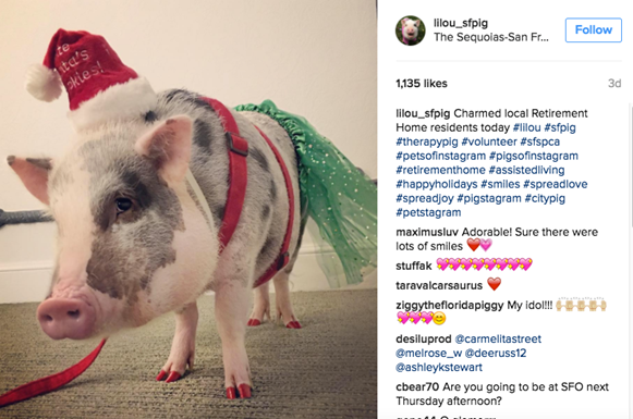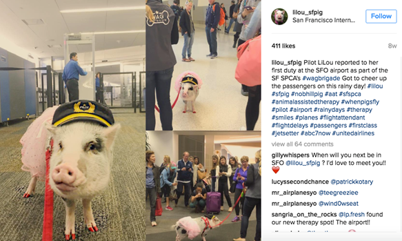 Lilou is misschien wat minder zacht dan een labrador, het is namelijk een varkentje! Desalniettemin is Lilou het eerste gecertificeerde varken in het Dierentherapie Programma van de luchthaven van San Francisco. Ze is dan ook in korte tijd razend populair geworden, mede dankzij haar komische outfits en trucs. Zo speelt ze ‘piano’ en kan ze op haar achterpoten staan. Sterker nog, Ms Lilou heeft een eigen instagram account, met ruim 6.500 volgers!