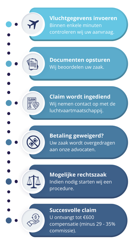 Zodra wij alle benodigde documenten van u hebben ontvangen, dienen wij uw claim in bij de luchtvaartmaatschappij. Dankzij onze transparante communicatie blijft u altijd op de hoogte en ontvangt u regelmatig updates over de status van uw claim.